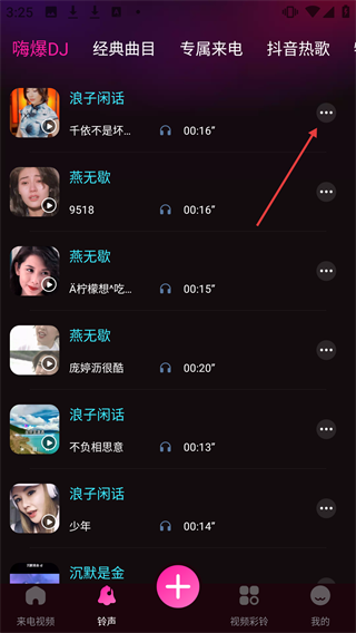 3、于铃声列表里,点击“浪子闲话”右侧的三点式按钮,使操作选项展开。