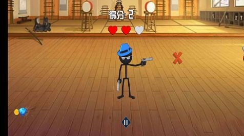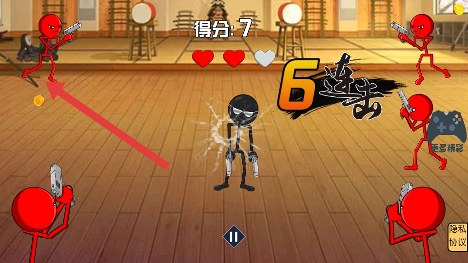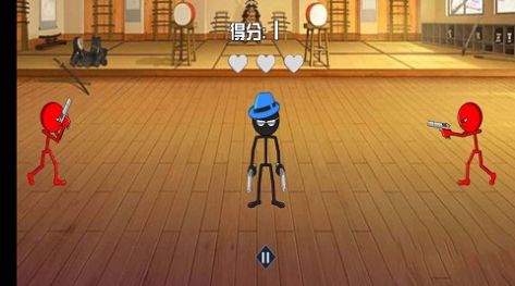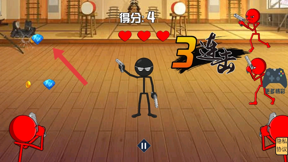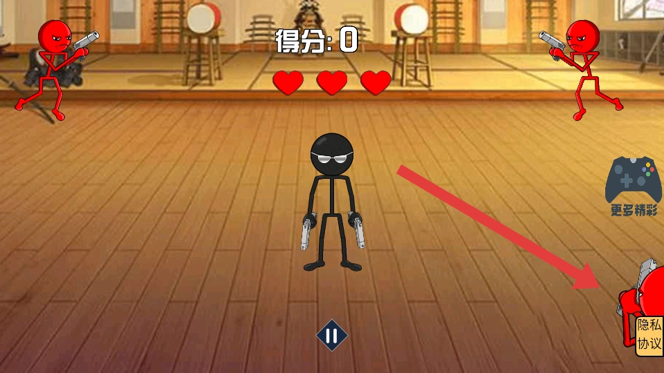 1、操控黑色火柴人,面对两侧及周围出现的红色持枪敌人,快速瞄准射击,注意初始3颗爱心代表生命,别让敌人近身攻击。