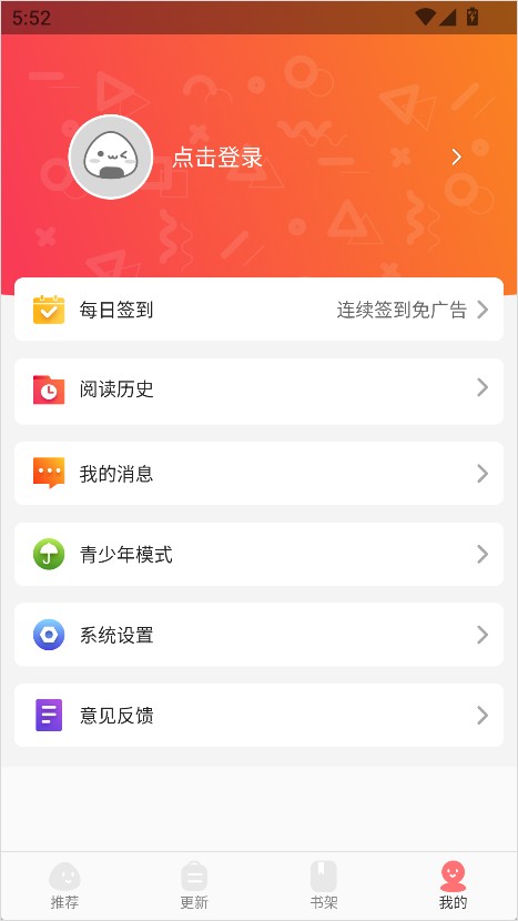 在这里可以看到每日签到、历史记录与设置功能,让阅读体验更加个性化、流畅自然。