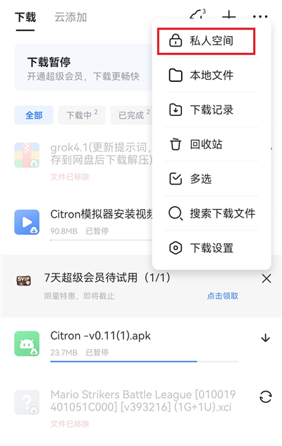 7、这个文件就会被隐藏,你可以继续在私人空间里下载。