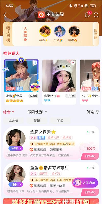 1、游戏约玩:超高技术的游戏高手,人美声甜的萌妹女神,美女帅哥大神齐聚。24小时随时约玩,畅享游戏欢乐!