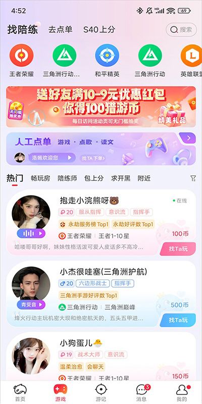 猎游官网正版是一款当下十分火热的语音交友和游戏陪练平台,在这里汇集了各种热门游戏主播大神,快速约玩,组队连麦,技能陪练,感兴趣的朋友可以下载试试看