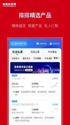 私募排排网官方版是深圳市前海排排网基金销售有限责任公司打造的基金平台,为用户提供全面行业资讯与投资服务,每日推送原创行业资讯、实时分享财经热点快讯,助力用户掌握最新市场动态与投资机会,同时打造独家专访频道、定期分享机构研究报告,为用户提供更深入的投资分析和决策依据。