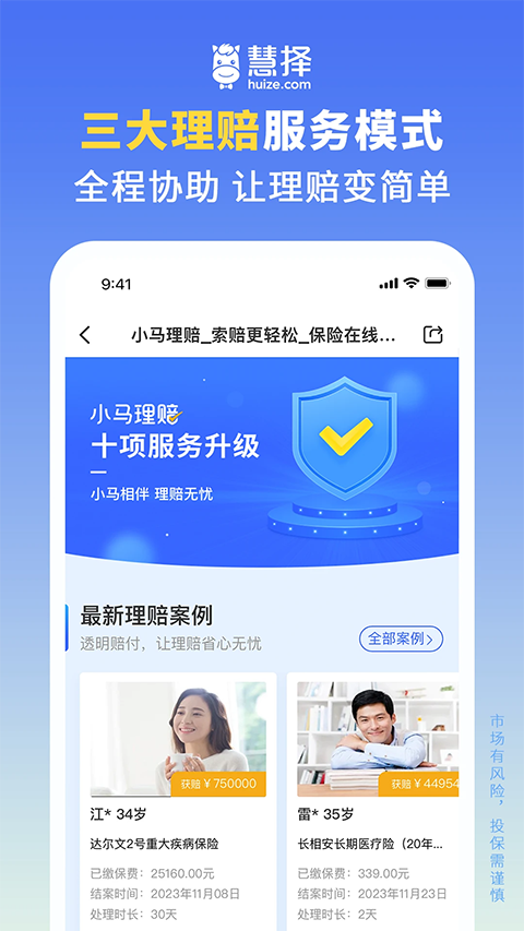 慧择保险网官方正版由慧择保险经纪有限公司开发,是一款出色的保险购买服务平台,它为用户带来众多保险购买建议,用户可依据自身需求进行保险选购,通过该平台,能让大家更放心地购买保险,满足不同人群对保险产品的多样化需求,助力用户轻松找到适合自己的保险保障。